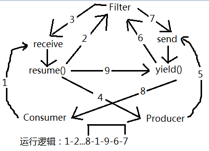 图画的不太好,可以先将filter遮住,它是过滤器对两个程序之间传递的信息进行处理。去掉filter逻辑就更清晰些了,就是两个“线程”(其实是两个协同程序)互相调用。resume回到yield处开始,支持嵌套,返回到栈顶的yield位置。yield是非阻塞的“线程同步”。这到有点像linux里的管道通信。