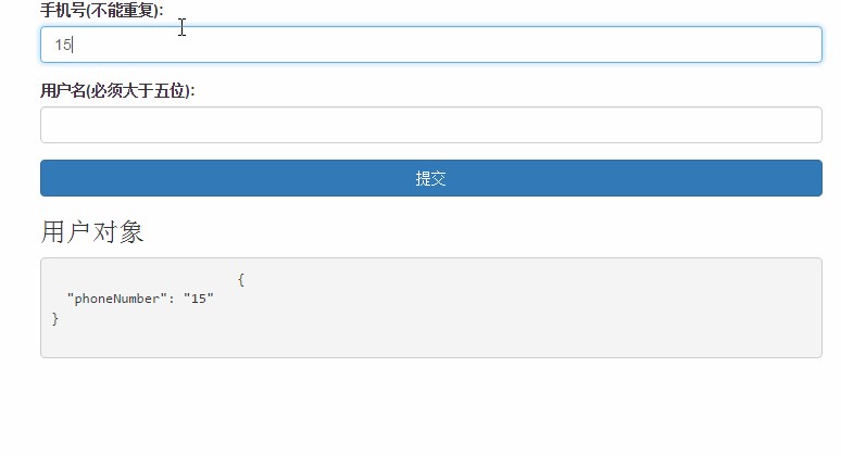 另外,在这个controller对象上,还有一个$asyncValidators对象,如果你的验证是异步的,则需要加验证附加在这个对象上,比如说用户注册时输入手机号,我们需要在后端验证该手机号是否已经注册,这个验证方法必须return一个promise对象,然后在验证通过时调用延迟对象的resolve,失败时调用reject,还未完成的异步的验证存储在ngModelController.$pending中。