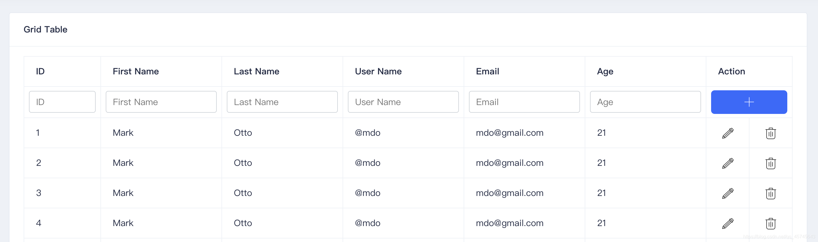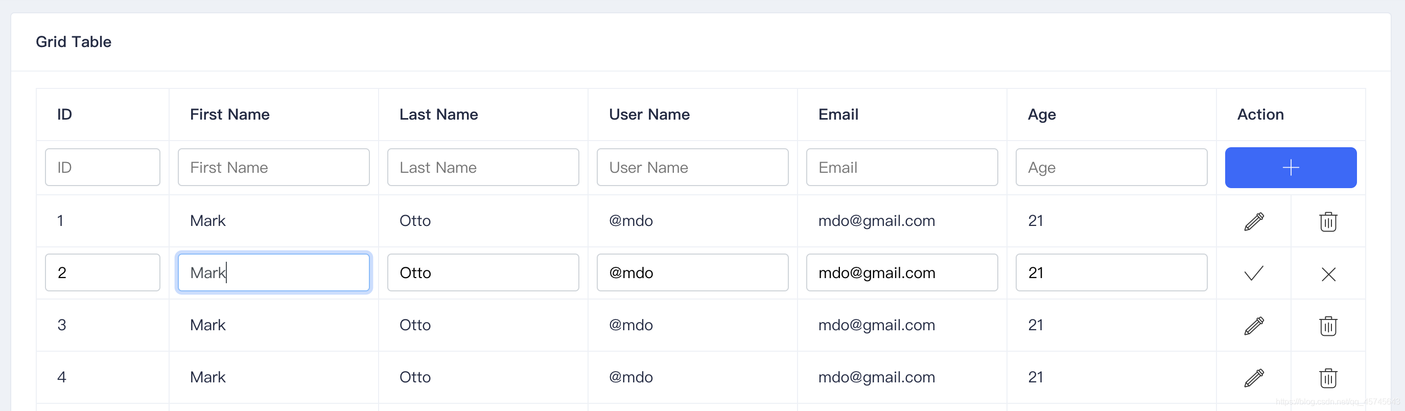 在我们的实际业务中可能遇到这样的需求,一个 table 表格,最后一列有修改、删除或者其他操作,当我们点击修改按钮的时候,当前这一行的内容都出现在一个 input 输入框里面,然后我们可以直接进行修改,这个时候我们就可以使用 *ngif 和 else 来实现。效果图如下: