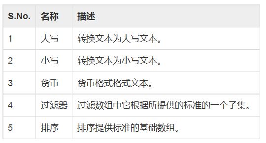 过滤器是用来更改修改数据,并且可以在表达式或使用管道符指令将其归入。以下是常用的过滤器的列表。
