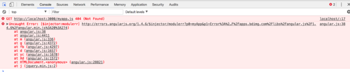 (2)排查文件的路径。 排查文件名是否正确,这事简单; 而排查文件的路径,就是一个技术活儿了。 为什么这么说呢? 这是因为,在angularjs中,有一个静态资源的概念。myapp.js文件分明是存在的,为何找不见呢? 先来看引用myapp.js 的那行代码。