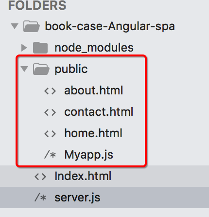 为了实现这样的单页面应用,书中创建了html文件(index.html、home.html、about.html、contact.html), 还有一个 myapp.js 用于router 和 controller, 并创建了应用程序的入口server.js