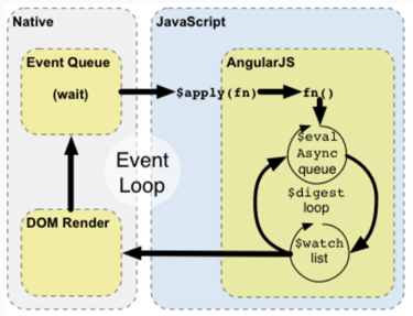 浏览器持续等待例如用户交互这样的事件。当你在一个<input>标签里输入字符之后,这个事件的回调函数在js解释器中执行了其包含的dom操作,执行完毕后,浏览器响应地对dom做出了变化。angular拓展了这个事件循环,使它有时候成为angular context 的执行环境。