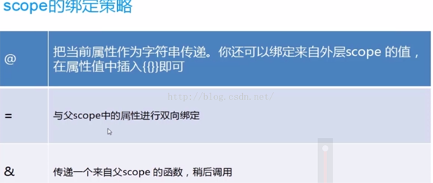 通过把scope设置为{},那么每一个指令就具有自己独立的scope空间,于是就不会相互影响了。但是angularjs中最重要的概念是:绑定策略。其具有绑定策略如下: