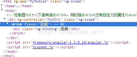 <!--控制器myctrl下面有指令drink,同时指令drink还有自定义的属性flavor,其值为‘百威'-->