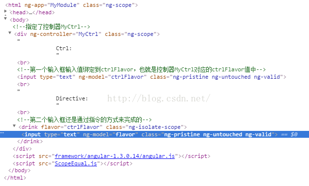 <!doctype html> <html ng-app="mymodule"> <head> <meta charset="utf-8"> <link rel="stylesheet" rel="external nofollow" rel="external nofollow" rel="external nofollow" rel="external nofollow" > </head> <body> <!--指定了控制器myctrl--> <div ng-controller="myctrl"> ctrl: <br> <!--第一个输入框输入值绑定到ctrlflavor,也就是控制器myctrl对应的ctrlflavor值中--> <input type="text" ng-model="ctrlflavor"> <br> directive: <br> <!--第二个输入框还是通过指令的方式来完成的--> <drink flavor="ctrlflavor"></drink> </div> </body> <script src="framework/angular-1.3.0.14/angular.js"></script> <script src="scopeequal.js"></script> </html>
