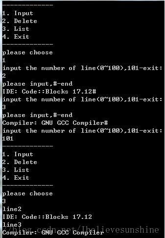 预期实现三个功能,第一,可以对指定的行输入字符串;第二,删除指定行的字符串;第三,显示编辑器的行数和内容。