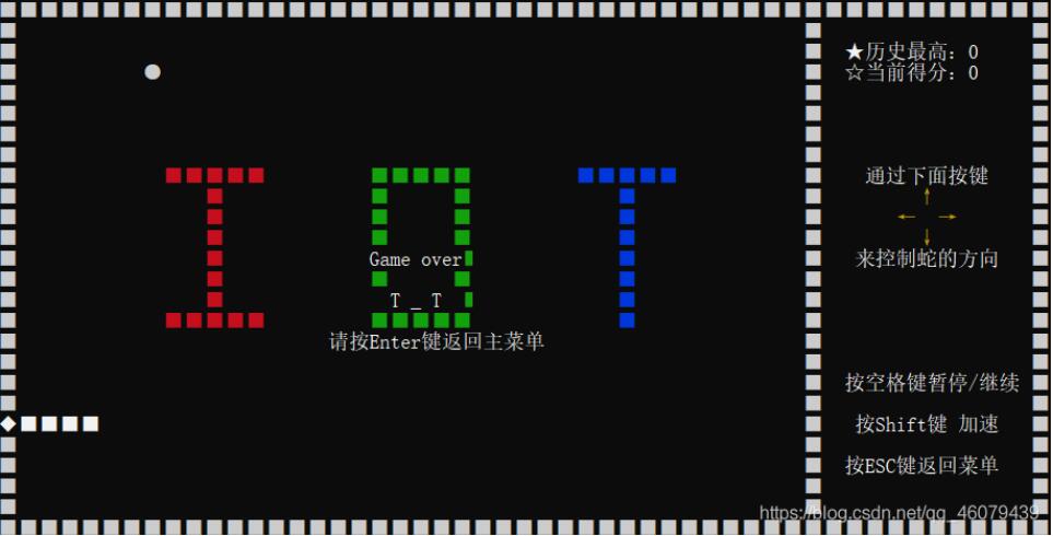 printf("墙或蛇头撞到自己身体或撞到障碍物,游戏结束。");