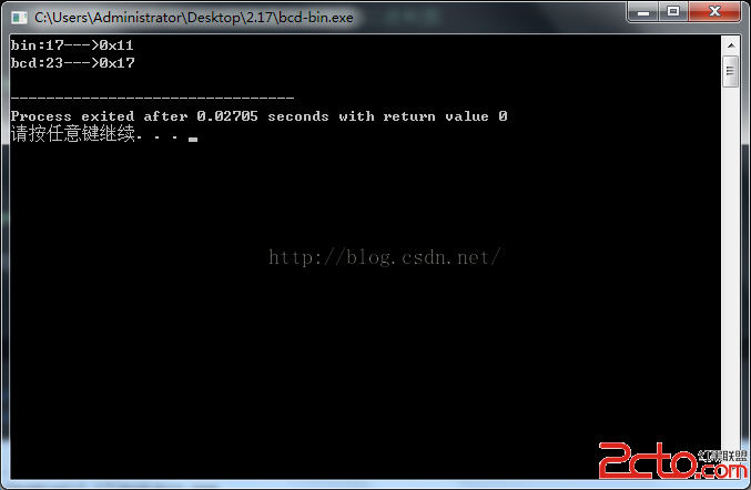 运行结果: 从结果可以看出17的二进制数是0001 0001---->对应16进制0x11 将17转为bcd码后4个位表示一个位,所以就表示为二进制数0001 0111----->对应16进制数0x17也就是十进制的23
