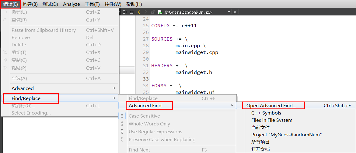 高级查找位置:edit - find/replace - advanced find - open advanced find