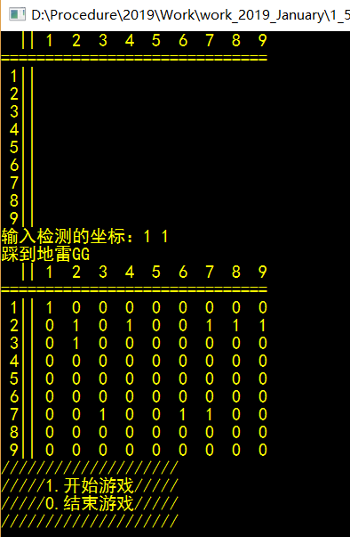 4.定义有地雷的地方为‘1’,if (mine_map[row][col] == ‘1’),如果挂掉就 Display_Map 打印所有信息棋盘