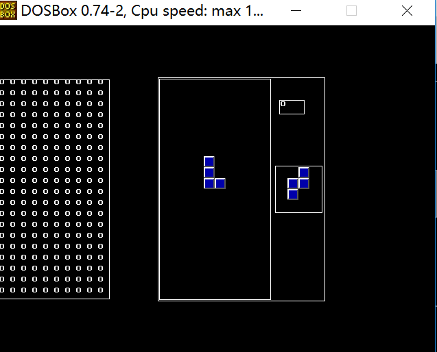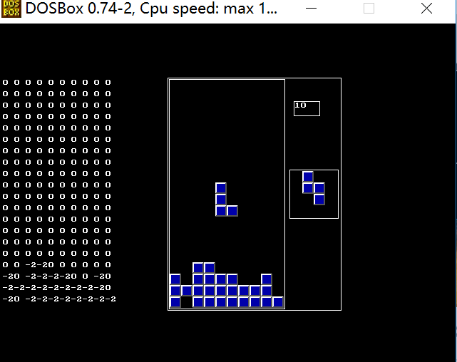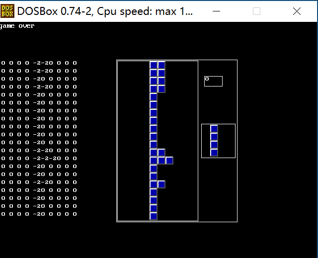 俄罗斯方块游戏效果图,通过TC运行,左侧的是数字矩阵是游戏的内部数据结构