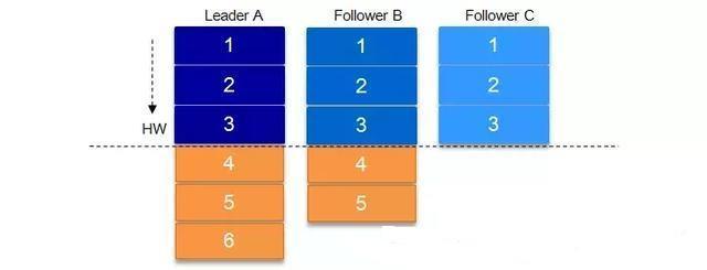leader还会维护high watermark (HW,可以翻译成高水位),是指分区中最后一次提交消息的offset。HW会被不断传播给follower副本: