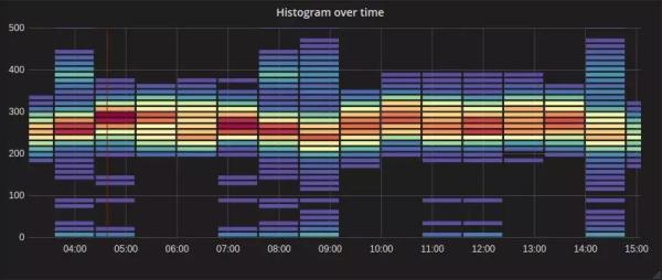 另一种常见的可视化是热力图。在查看直方图时很有用。此类可视化类似于条形图,但可以在条形图中显示表示整体度量标准的不同百分位数的渐变。例如,假设正在查看请求延迟,并且希望快速了解所有请求的总体趋势和分布。 热力图对此非常有用,它可以使用颜色快速浏览每个部分的数量。