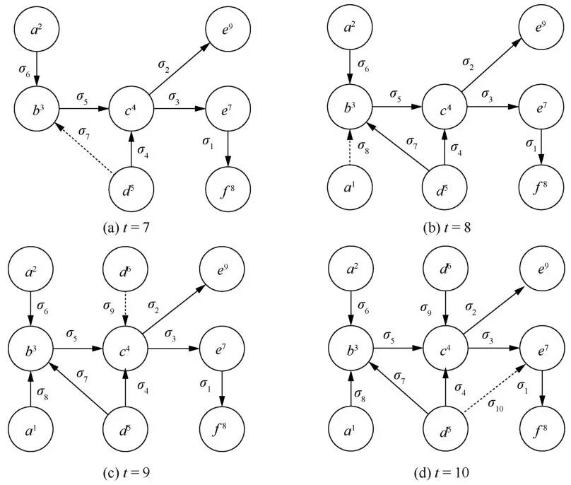 图2给出了带时间窗口的图数据流的模型示例。给定时间窗口后,在时间窗口内的边所生成的图称为当前时间下的 图数据流的快照,如图3所示。
