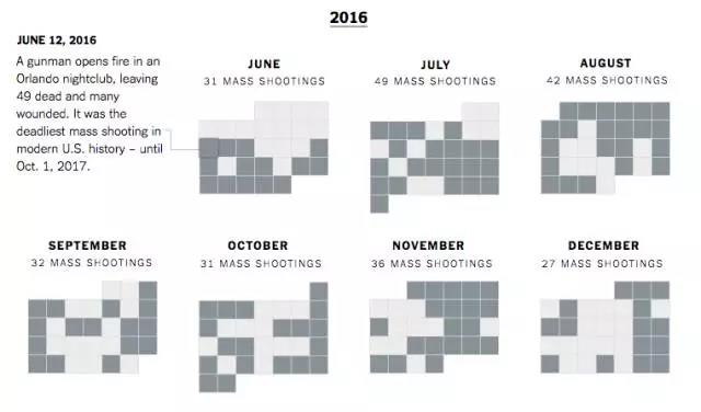 Groeger指出,数据可视化的趋势之一就是简化。 “在某些方面,这可能是对疯狂、复杂的可视化的一种解决方案。而且,简单的可视化效果在手机上的效果往往更好。” 纽约时报的“有关美国大量枪击案的社论”就是一个很好的例子。该图形由存在枪击案的月份组成,并突出显示有枪击案的那一天。 Groeger说:“日历是数据可视化简单而又强大的表现方式。 这是泰晤士报的一篇社论,这张图说明了可以将数据压缩成一张图表,并表达出作者的观点。”