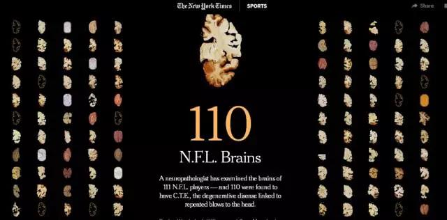 纽约时报的“足球运动员的脑部伤害”使用了这种技术,110名足球运动员的大脑并排显示在一起,因此,它们之间的变化很容易看出来。