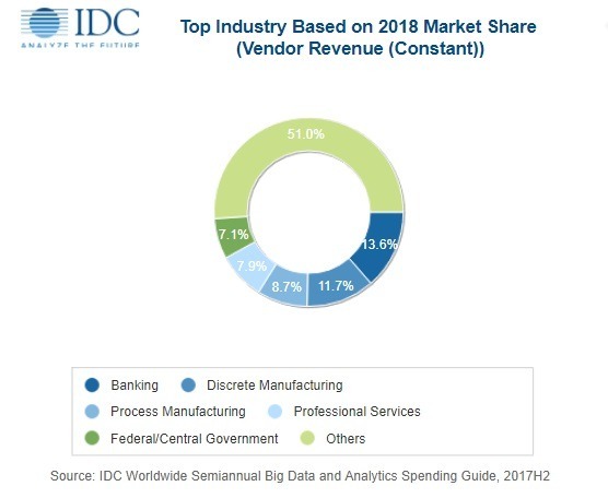 在整个预测期间,对大数据和业务分析解决方案投资最大的行业包括银行业、离散制造业、流程制造业、专业服务业、联邦/中央政府。总的来看,这五个行业今年将占到全球BDA收入的近一半(810亿美元),也将是2022年BDA机会最多的行业,届时这些行业的总投资额将达到1290亿美元。BDA收入增长最快的行业是零售业(复合年增长率13.5%)、银行业(13.2%)和专业服务(12.9%)。