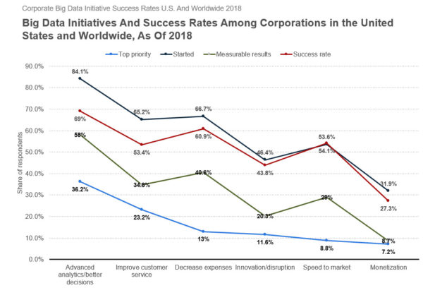 (10)84%的企业推出了先进的分析和大数据举措,以提高准确性,并加速他们的决策。根据最新的NewVantage Venture Partners Survey调查,专注于此领域的大数据举措的成功率最高(69%)。超过三分之一的企业(36%)认为这一领域是高级分析和大数据投资的首要任务。