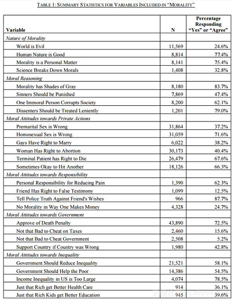 Richard设置了很大的样本数据,对受访者询问了一系列用以衡量道德的数据。包括对道德理念的认知、道德逻辑、个人行为、责任观点、对政府态度与对不平等现象认知等,涉及问题如下: