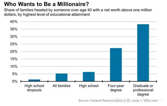 美联储St.Louis 分部的统计数据,说明了家庭中受教育程度最高者(需大于40岁)的受教育程度与家庭净财富超过100万美元的比例的关系。可见绝对财富的级差比收入级差触目惊心多了。硕士学历以上家庭比高中学历家庭的百万富翁比例高30倍。