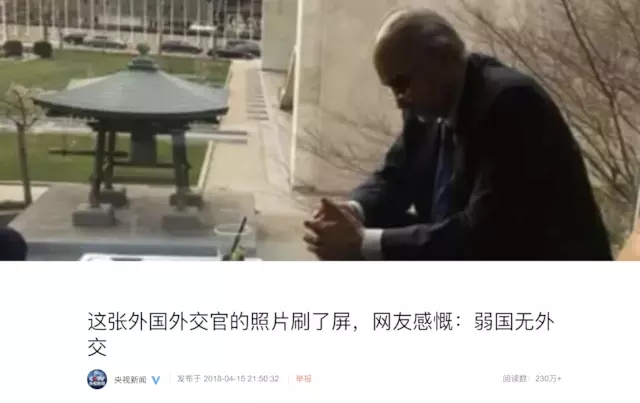 在中文互联网上,和民族主义有关的假新闻是最为猖獗,而且受众广泛的。举例来说,4 月 15 日美军因使用化学武器空袭叙利亚军事目标之后,中文社交网络上流传了一张所谓“叙利亚驻联合国代表贾法里低头枯坐,弱国无外交”的照片。这张照片所配的文字迎合了某种情绪,但仅以事实来说,这张照片和配文是附会的。