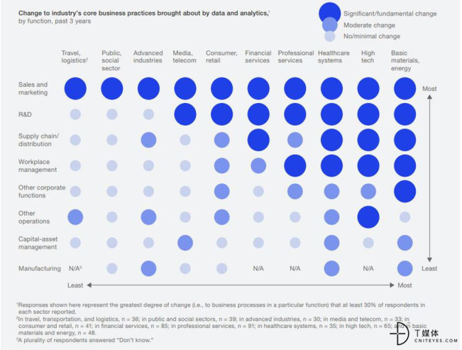 首先的图片还是来自于McKinsey的研究报告,近50%的受访者表示,分析和大数据从根本上改变了他们的销售和营销职能。此外,超过30%的受访者表示,在不同行业的研发领域中也是如此,而分析和大数据对高科技和基础材料与能源行业的推动作用最为明显。