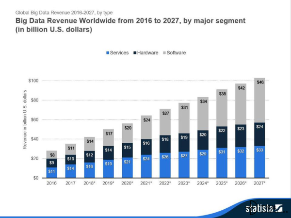 据Statista报道,全球大数据软件与服务的市场收入预计将从2018年的420亿美元增加到2027年的1030亿美元,年复合增长率为10.48%。