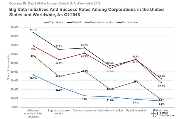 根据NewVantage的调查,84%的企业推出了高级分析和大数据的计划,以提高准确性并加快其在这一领域中高的决策过程。同时,超过三分之一的企业表示,加快决策过程是他们计划中的首要任务。