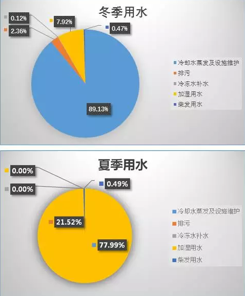 腾讯某数据中心用水情况,我们选取了夏季和冬季各一周的时间,分析各用水数据及所占比例,如下图所示: