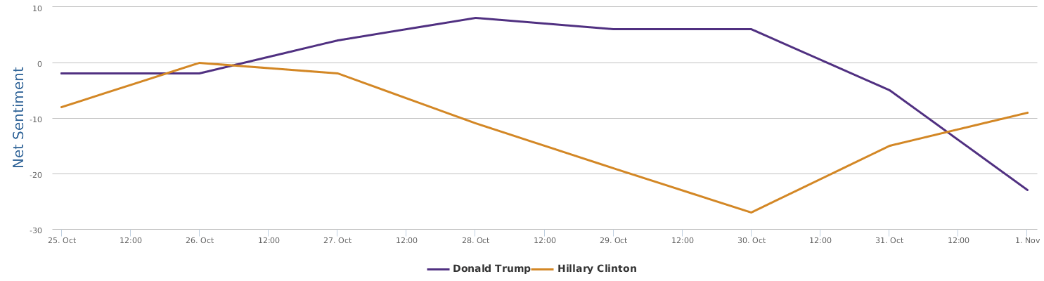 到现在为止一周的平均舆情,川普是2%,而Clinton是-12%,可见希拉里完成大逆转主要不是靠提升自己的社交媒体支持率(过去一天还是-12),而是把川普拉下水,把川普从周平均的+2拉到了现在的-12。