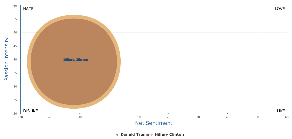 从下图可以看出:川大爷的舆情气泡整个被希大妈的气泡包住了,严严实实。虽然舆情体现出美国人民对他俩都不感冒,但貌似希拉里气场和声量压过了川普。