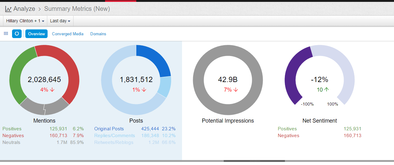 传统的新闻民调,CNNpoll显示希拉里领先5个百分点,而其他的民调有曾一度只领先1个百分点的记录。虽然都比之前的领先幅度缩小,但仍然领先。川普阵营批判说这些个民调都是被操纵的,他们那边的民调是川普领先。这些个极小数据的民调极易偏差,公婆各有理,咱们还是看真正的大数据吧!下面是川普与希拉里最近24h的bigdatasummary对比。
