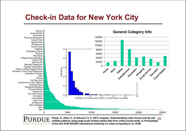 社交媒体数据形式多样,在Hasan,S.,Zhan,X.,&Ukkusuri,S.V.(2013,August)。Understandingurbanhumanactivityandmobilitypatternsusinglarge-scalelocation-baseddatafromonlinesocialmedia.InProceedingsofthe2ndACMSIGKDDinternationalworkshoponurbancomputing(p.6)。ACM.文章中使用纽约的check-in数据来对城市模式进行分类。