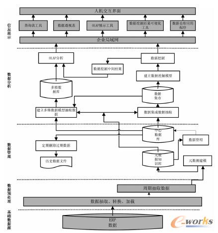 (3)数据分析:这个阶段是实现商务智能系统真正智能化的阶段,主要利用联机分析处理和数据挖掘技术,对从数据仓库中提取的数据进行汇总和多维分析,挖掘出数据背后隐藏的知识。