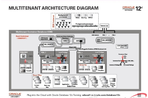 Oracle数据库12c的组成包括三个部分,分别是最底层的CDB(Container Database),中间层的Root以及最上层的PDB(Plugable Database)。每个PDB都是一个可独立插拔与管理的数据库;Root则是用来定义需要共享的后端内容,比如修补程序更新,只需要在Root做一次,在Root之上运作的PDB就可以多个一起完成更新;CDB则是一个后端平台,让数据库管理员可以将多个PDB数据库当作一个来管理,对于终端用户来说并没有任何差异。当数据库需要迁移时,拔出的PDB会携带自己的信息与设定,比如修补程序以及加密信息等,而若需要扩展PDB时,则需要另外增加内存才能应用。