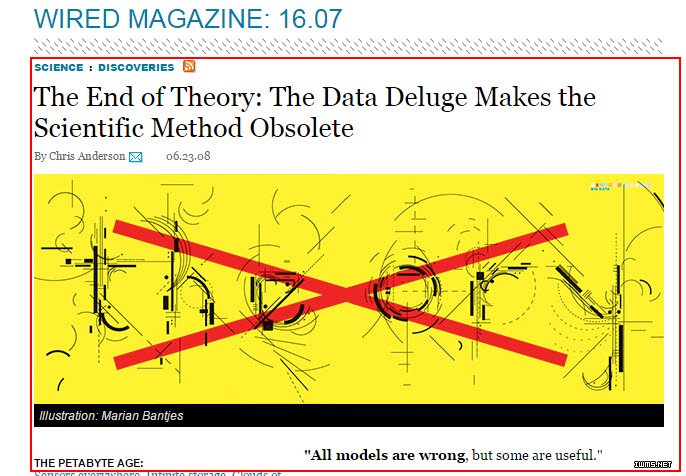 “要相关,不要因果”,这个观点其实并非舍恩伯格首先提出的。最早的提出者应为《连线》(Wired)主编Chris Anderson ,2008年他在题为 “理论的终结:数据洪流让科学方法依然过时(End of Theory: the Data Deluge Makes the Scientific Method Obsolete)【9】” 文章中,率先提出:在PB时代,我们可以说,有相关性足够了(Petabytes allow us to say: "Correlation is enough)"。