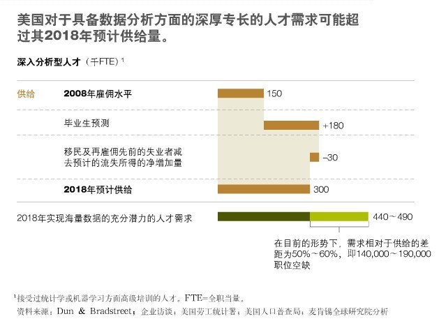 通过大数据实现价值的一个重要制约因素是人才短缺,尤其是拥有统计学和机器学习方面专长的人,以及知道如何通过运用从大数据获得的洞见来运营企业的管理者和分析师。