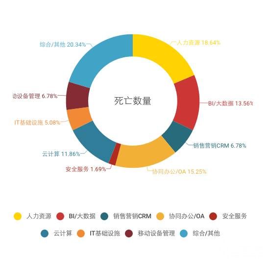 3年内,一共有69家企业服务的公司倒闭或被收购。本地生活领域,3年内死亡了92家,电商领域3年内死亡了158家。相对于O2O、电商领域,企业服务领域的死亡数量,确实不算多。在企业服务领域,死亡数量最多的人力资源、协同办公、大数据以及云计算,也恰恰是近几年最火的几个方向。