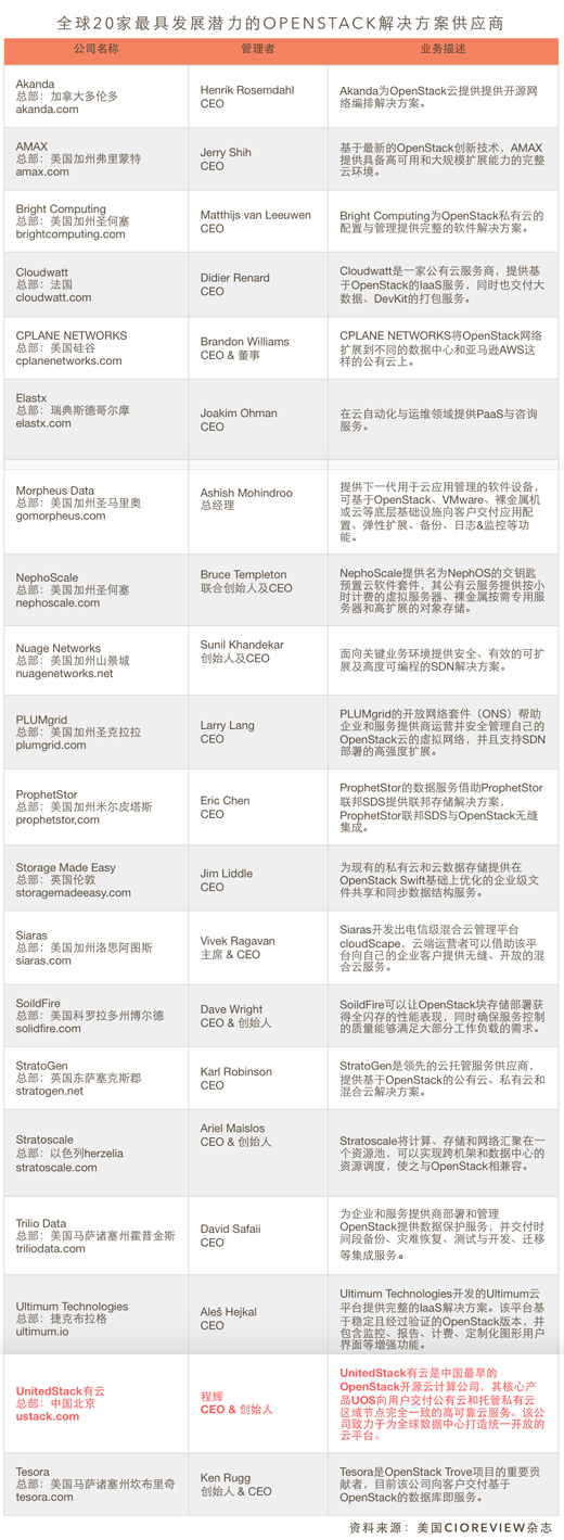 过去的几个月中,美国《CIOReview》杂志对上百家OpenStack市场的玩家进行了分析,甄选出一些在市场竞争中处于领先位置的供应商。为了帮助企业找到适合业务需求的最佳解决方案,CIOReview共评选出20家最具发展潜力的OpenStack解决方案供应商。这些供应商的解决方案正在企业客户群体中不断扩大影响力,向更多的行业机构和企业交付基于OpenStack的高效云服务。值得注意的是,来自中国的开源创业企业UnitedStack有云成为入围此项评选的唯一亚洲企业。