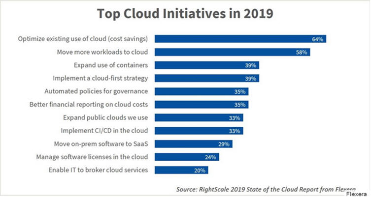 报告中揭示的一项重要发现是,许多组织面临着云计算支出不断增长的挑战。规模较大的企业在公共云中运行33%的工作负载。这产生了成本高昂的公共云账单,13%的组织的每月云计算支出超过一百万美元(每年达到1200万美元)。此外,各种规模的组织预计2019年公共云支出将增长24%。