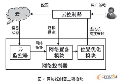 云控制器主要负责管理物理资源、监视物理机、放置虚拟机和分配存储空间等。一旦用户有新的部署策略请求,云控制器就会根据新请求分配和部署物理资源。此外,为了配合网络控制器,云控制器需要将用户的策略经过翻译,传输给网络控制器,以便网络控制器判断当前网络配置状态并进行新的虚拟网络部署。