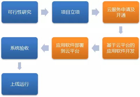 第二,由于云平台通过自动化技术完成了硬件设备和基础软件的部署和配置,业务系统的实施过程中不再需要部署和配置硬件设备和基础软件了,只需要在申请的云服务(虚拟机服务、存储服务、中间间云服务等)基础上部署和配置业务系统的专有软件。所以上述的“硬件安装及配置”和“基础软件部署及配置”两个环节可以省掉。