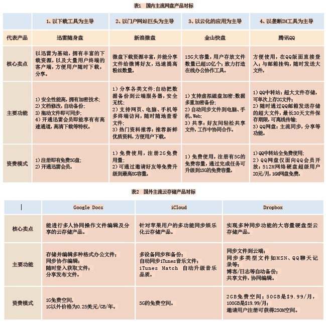在国内市场云存储产品呈现多元竞争并存的态势。从云存储产品企业看,各家基础应用趋同,但在产品发展线路上略有差异(如表1):