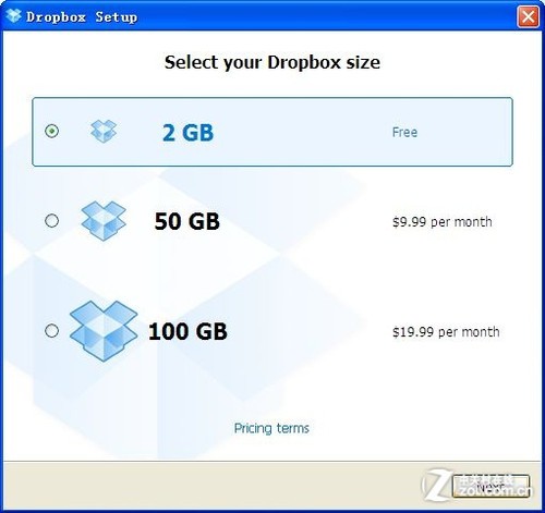 初次注册Dropbox的用户可以获得2GB的免费存储空间,此后,每次按照要求完成一系列的任务就可以获赠250MB存储空间,10GB封底。当然,也有收费的存储服务,50GB每月收费9.99美元,100GB每月收费19.99美元。