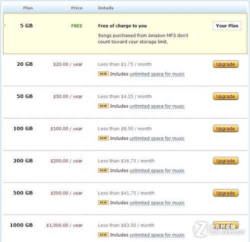 除了亚马逊云存储Cloud Drive赠送的5GB空间之外,如果你想增加存储空间,就需要付费了,价格是每年1GB收费一美元,如果你增加20GB,每年将支付20美金的,增加100GB每年支付100美金,以此类推。这生意做的,是不是有点太过“死板”。