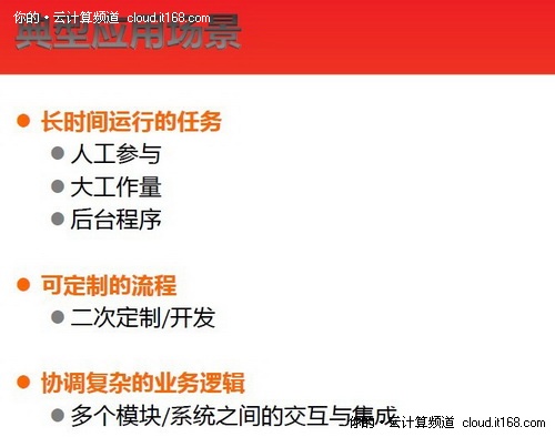 杨光指出,适合工作流的场景主要有三个:首先是长时间运行的任务适合使用工作流,杨光表示所有有人参与的流程基本都是长时间,如审批,办证等;第二,可 二次定制的流程适合使用工作流,很多时候工作流的运行人员不是开发人员,首先他们不知道代码,而且每个公司的流程都不一样,如果想要提供一个工作流系统让 他们使用,需要提供一个模板,让他们可以自己开发,这样工作流就很方便了;第三个场景就是协调复杂的业务逻辑,许多系统都不是单一的,而是非常复杂的,用 户可以使用工作流来描述整合的过程,这样就可以把工作精力放在核心的模块上。