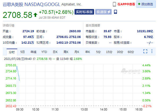 新浪科技讯,7月28日晚间消息,谷歌A涨4%,股价续创历史新高,报2752.86美元。截至发稿,谷歌A上涨2.68%,报2708.58美元每股,总市值达18151.89亿美元。