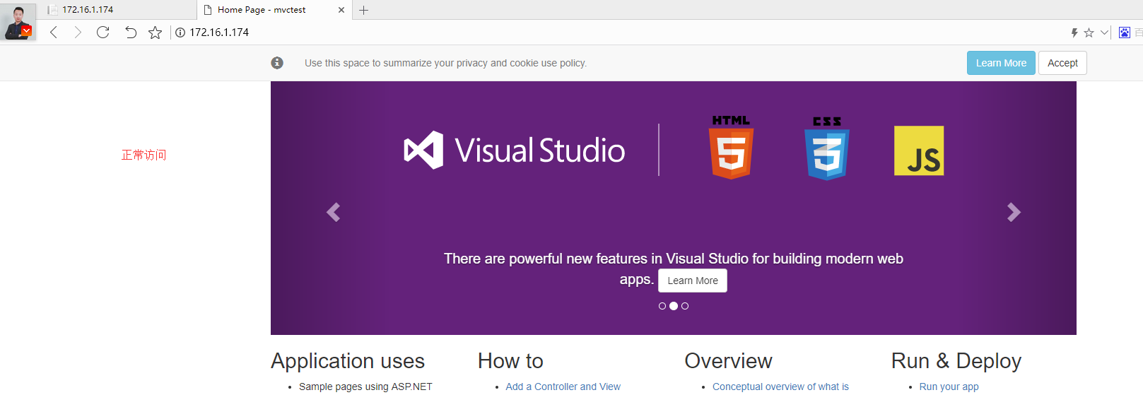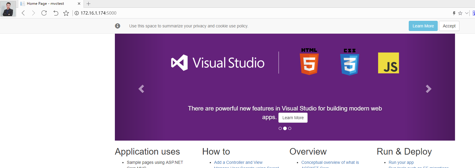 上面的指令就是运行我们新打包的镜像,并通过-p参数映射容器的5000到宿主机的80端口,其中-d参数告诉docker以后台任务形式运行镜像。因为80是默认的web端口,所以我们通过浏览器直接访问ip即可访问到我们容器中运行的MVC网站