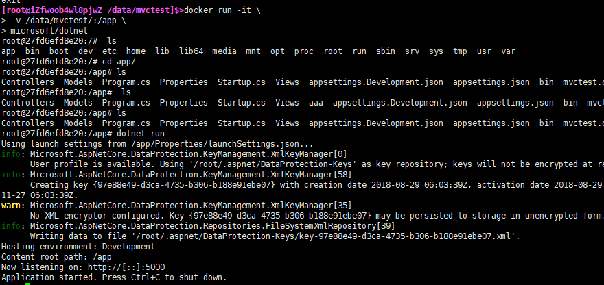 > docker run -it microsoft/dotnet //启动一个dotnet镜像 > dotnet new mvc -n mvctest //创建项目名为mvctest的.NET Core MVC项目 > cd mvctest //进入mvctest文件夹 > dotnet run //启动.NET Core MVC项目